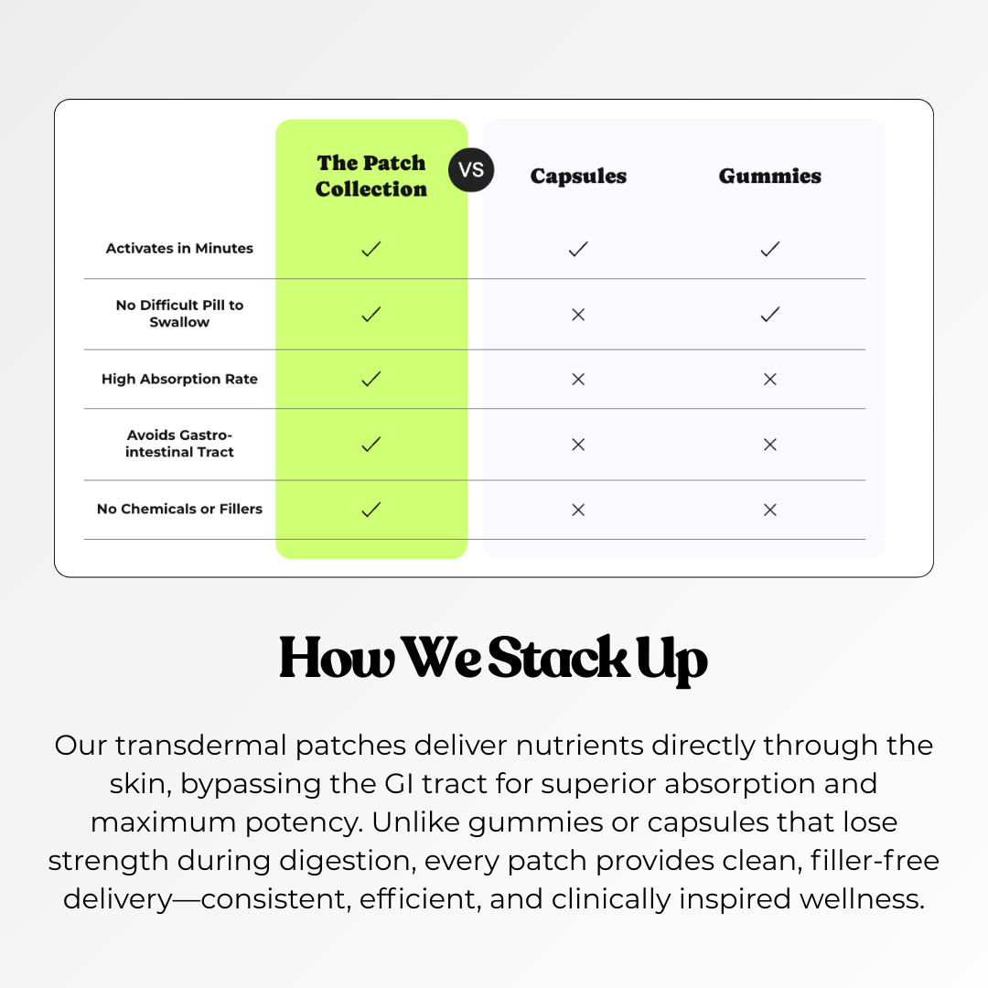Our vitamin-infused wellness patches start working right away. Once applied, ingredients are absorbed through the skin within minutes, providing steady support throughout the day.